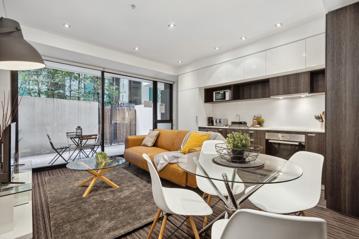 Prestigious Airbnb Select Apartment. Free onsite EV charger ! Soak up the energy of this funky, award-winning apartment. Bright, contemporary art and beautiful mosaic walls make this a truly exceptional, inspiring space. Lounge in the stylish courtyard and just relax! Please note that an oversized 4WD or Van will not fit in the security parking . There is 24 hour free permit parking outside for these vehicles Australian Open dates available