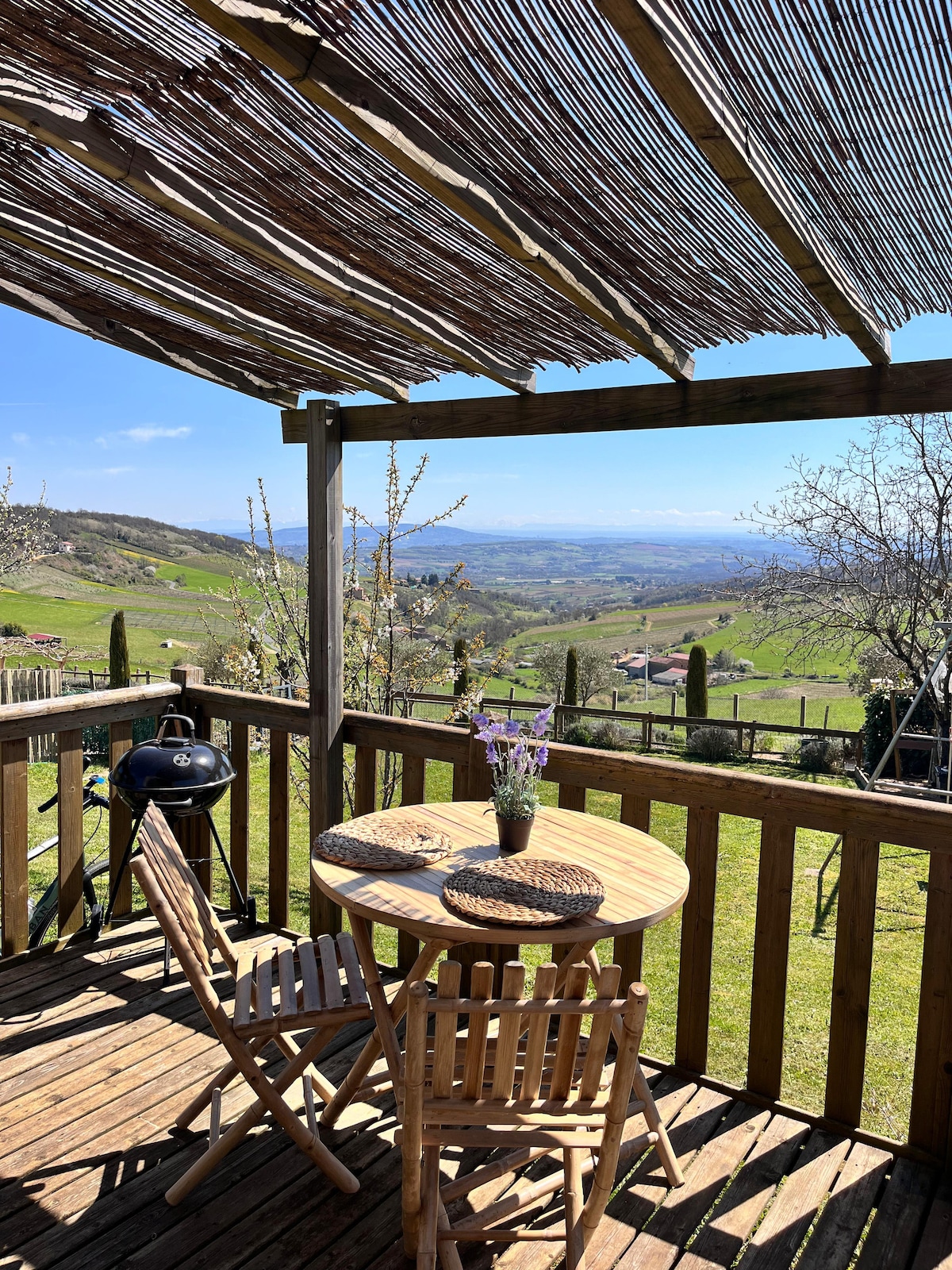 Quiet in a green environment, with stunning views, the location is ideal for discovering Beaujolais. Direct departure for walks, wine tastings, come and discover our beautiful villages in Pierres Dorées. We'll be happy to advise you. ⚠️it should be noted that to access the accommodation there is an outdoor metal staircase with steps in calbotis. Avoid if you have knee problems or if your pets don't go down the stairs.