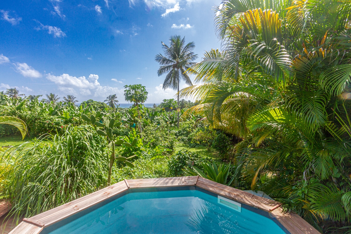 TI'KAZ Cannelle is a Creole-style bungalow made entirely of wood and tropical colors that can accommodate a couple with a child. Outside, a spacious wooden terrace brings together a dining area, a comfortable living room and its hammock overlooking the private pool and the garden with unique species: banana trees, papayas, hibiscus... Relaxation and change of scenery guaranteed!
