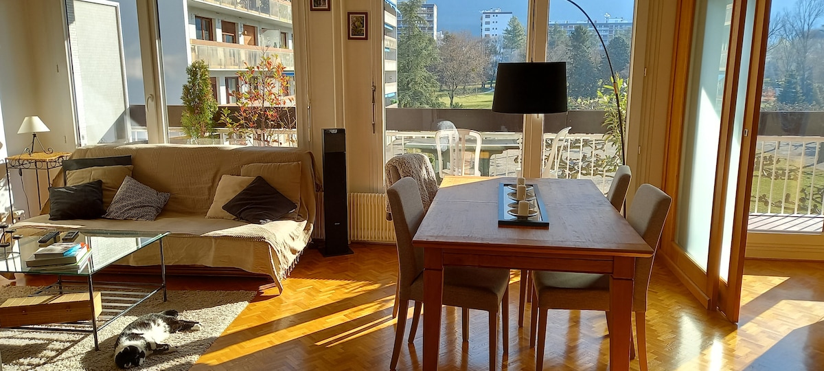 Agréable chambre d'hôte idéalement située, proche de Grenoble, à 5 mn à pieds du Tram E et 5 mn en voiture de l'Autoroute A 48. Bordé d'un grand parc arboré, l'immeuble est équipé d'un ascenseur et une place de parking est réservée aux locataires. L'hébergement comprend une chambre équipée d'un lit double ainsi qu'une salle d'eau privative (lavabo et douche) non attenante.