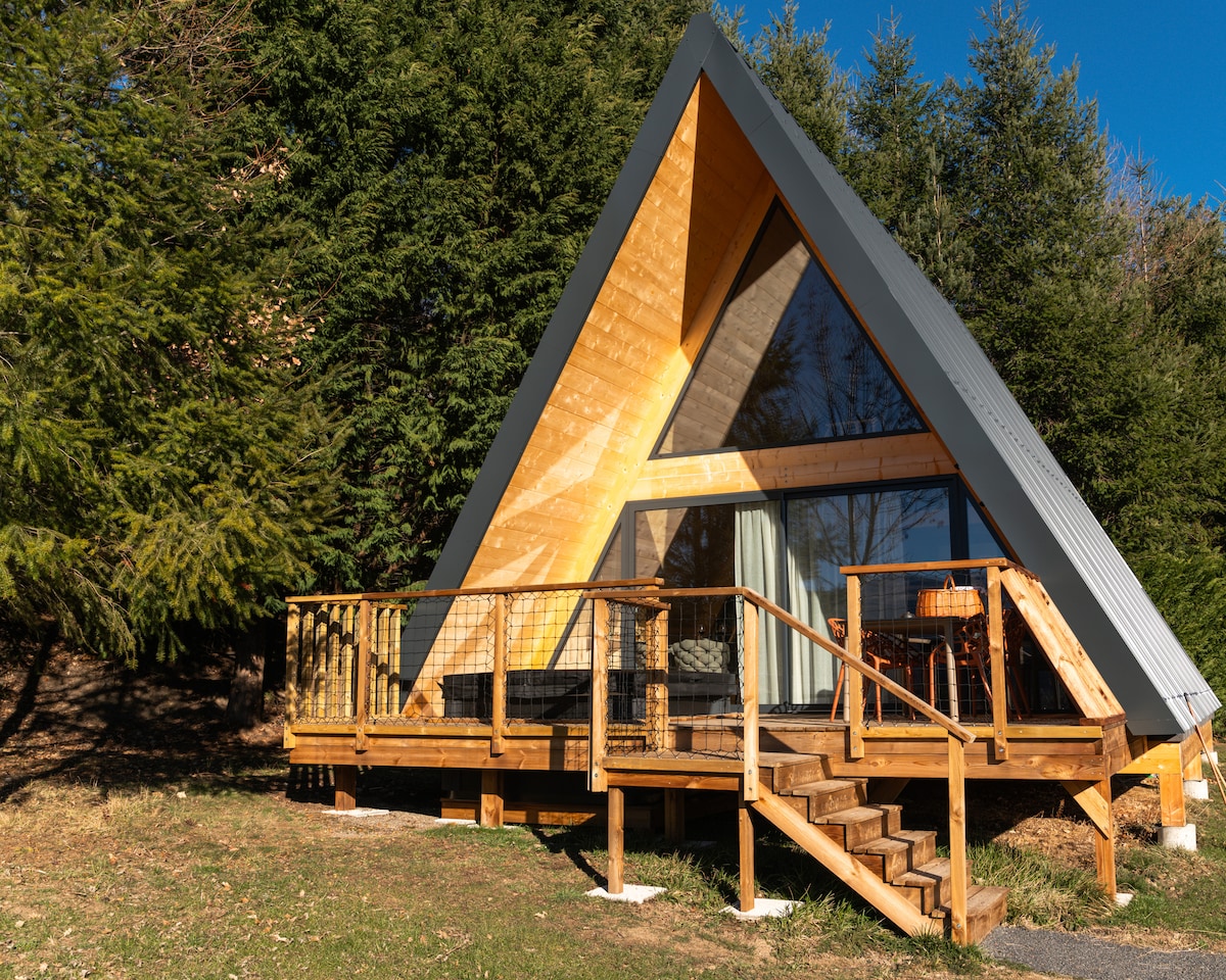 The Delta benefits from a kitchen open to a large living/dining room with pellet stove. On the ground floor is also a first bedroom with double bed, a bathroom, a separate toilet and a laundry room. Upstairs is the mezzanine bedroom with bathtub and double bed. Take advantage of the hammock to relax and access the 2 unusual beds. Access to the chalet is through a 35 m² terrace with private HOT TUB and outdoor furniture.