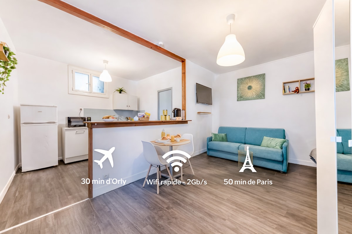 Charming 2-room apartment, fully equipped, ideally located between Paris and Fontainebleau. It has a bright living room with access to a balcony where you can have a meal, a modern fully equipped kitchen, a comfortable bedroom with 140x200 bed and a bathroom with walk-in shower. Close to amenities and well connected by transportation. Great for a relaxing stay or business trip. Free Wi-Fi and washing machine available.