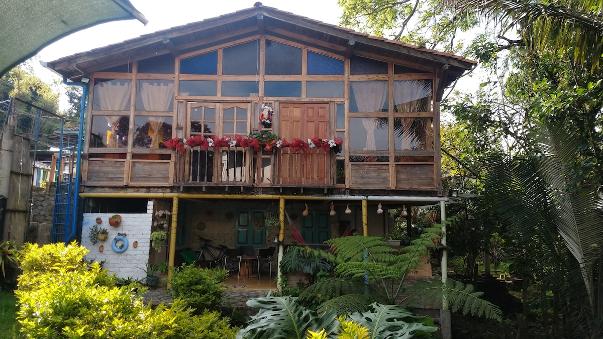 - Unique accommodation 15 minutes from the Salento park on foot. - Fully equipped kitchen. - Spacious living room with view to the mountains. - Cozy rooms with comfortable beds. - Wood-burning fireplace in the living room and main room. - High speed Wi-Fi. Possibility of expanding on demand. - 180 degree view from inside the house with wonderful sunsets. - Corridor of beautiful wax palms within the property.
