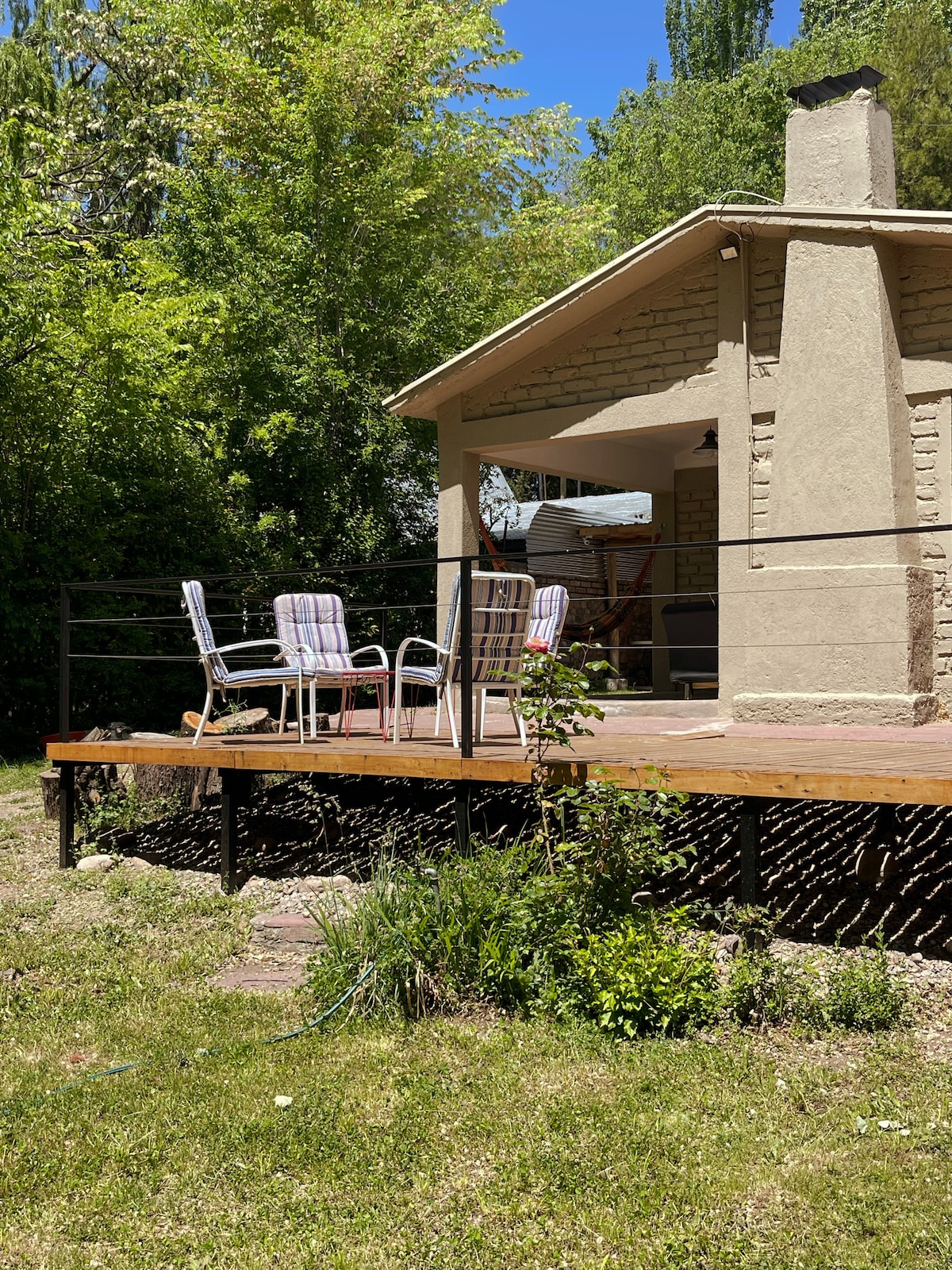 A mud house, made by a mosaic artist, full of details,in the middle of an agroecological estate where all kinds of fruits are grown,to delight the senses,a beautiful garden and garden of aromatics and medicinal, ah, we also have a garden of exotic catus and a Malbec grape vineyard. The access to the estate is very simple, it is 13 km from the city, (15 min) between the districts of Cuadro Benegas and Rama Caida, very quiet area with magnificent restaurants .