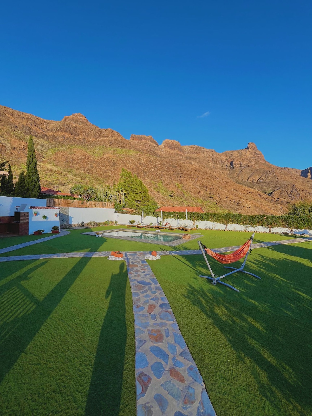 Located on the southern slope of the island, in the volcanic caldera of Tirajana, an idyllic place. The view opens 360° to the palm groves of the valley and the volcanic peaks. It has a heated and salt-treated swimming pool with a waterfall. It is on a property next to another vacation home for two people. Both houses are completely independent and have their own entrances and services, with parking and the pool being the only shared areas. Therefore, privacy is guaranteed.