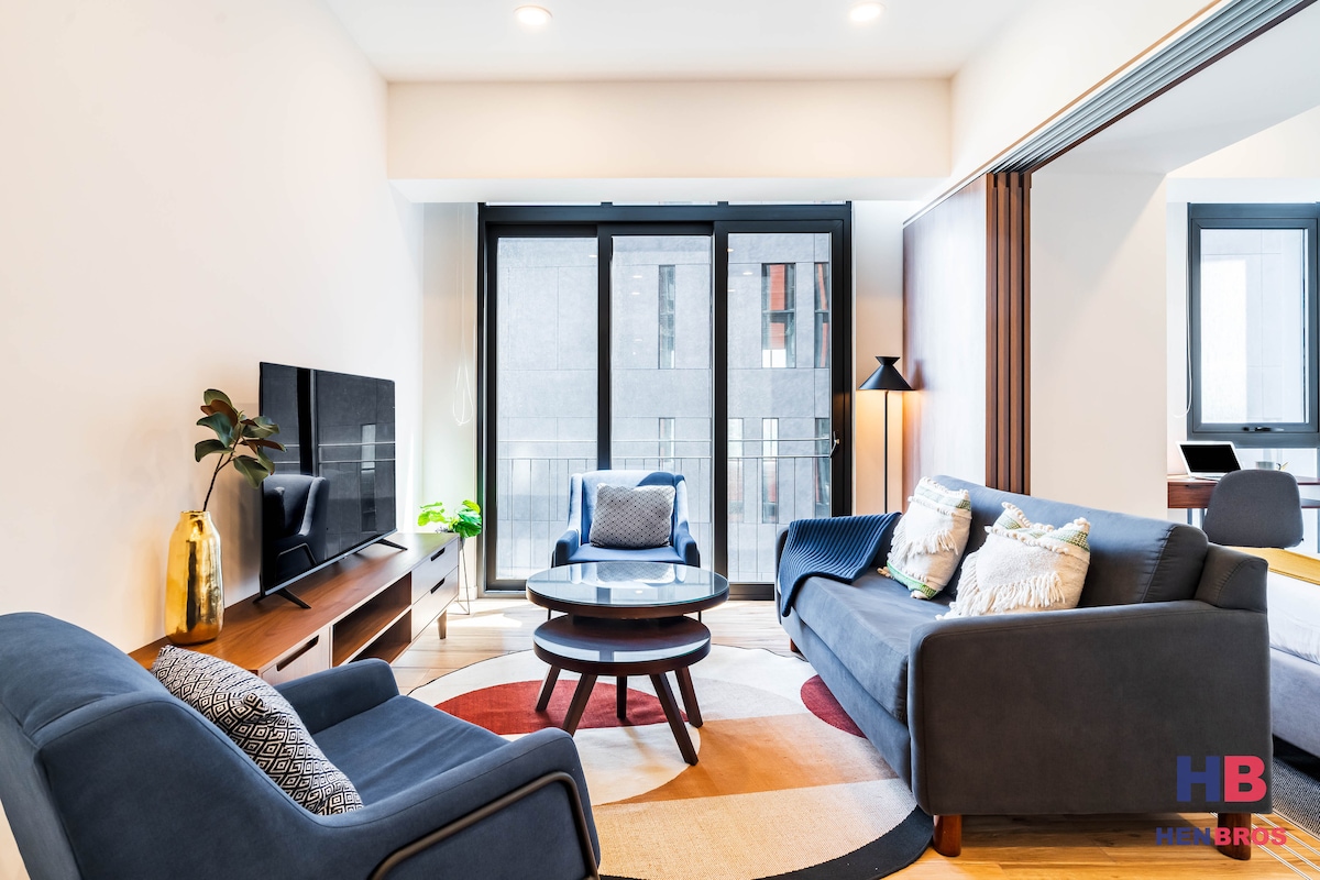 Stand at floor-to-ceiling windows and gaze at a bustling neighborhood. Admire the same view from a chic and serene bedroom in an ultramodern condo. The building offers extraordinary amenities including a soccer field and outdoor pool.