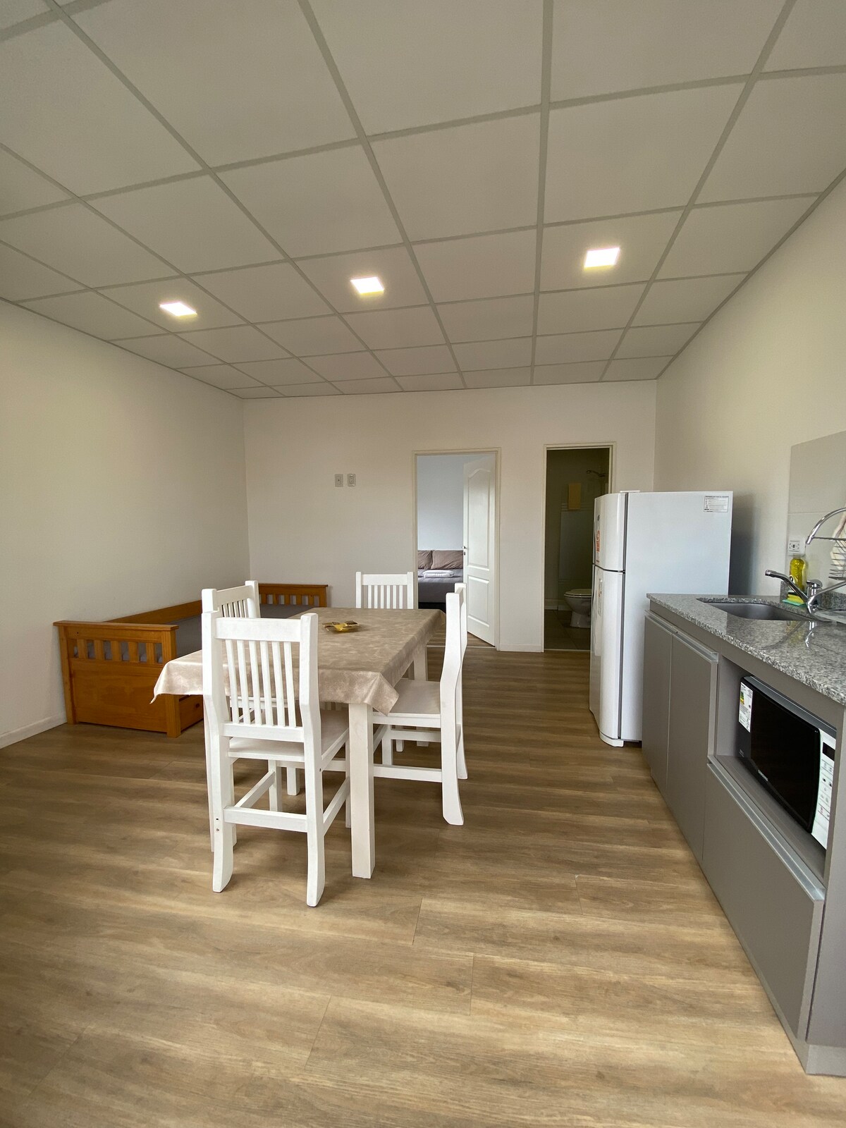 Enjoy the warmth of this quiet and centrally-located apartment. Brand new, just like all its equipment. Located 1 1/2 blocks from the main square. Quiet as it is in the heart of the block. Composed of 3 rooms: Bedroom with queen size bed base, large closet, Smart TV and air conditioning. Living room with armchair that also serves as 2 single beds, table/chairs, Smart TV with direct TV and air conditioning. Kitchen with large windows, refrigerator and microwave.