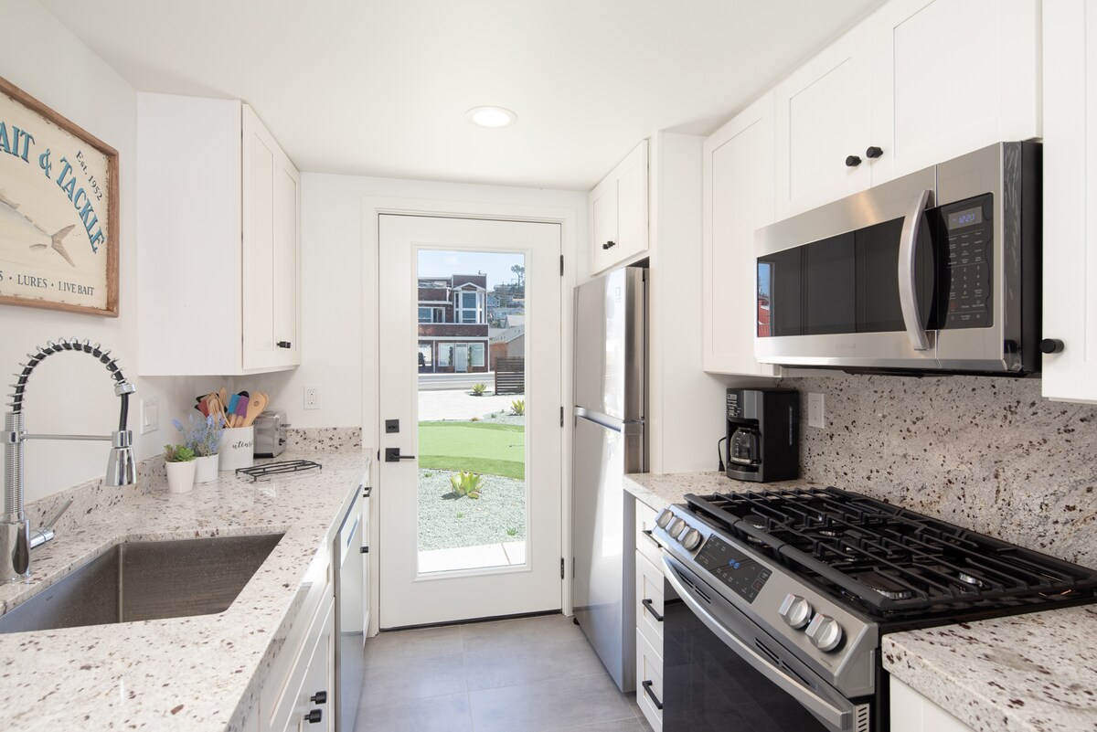 Brand new downstairs unit in a fourplex with superb location across from the beach and in downtown Cayucos! King in master, twin trundle in second, and sofa sleeper in living room. Bathroom has walk-in shower with double sinks. All new stainless steel appliances in kitchen. Flat screen TV (internet-ready; bring your streaming device), and electric fireplace. Patio with eating area. Shared common areas include laundry facility, outdoor kitchen (coming soon), and putting green!
