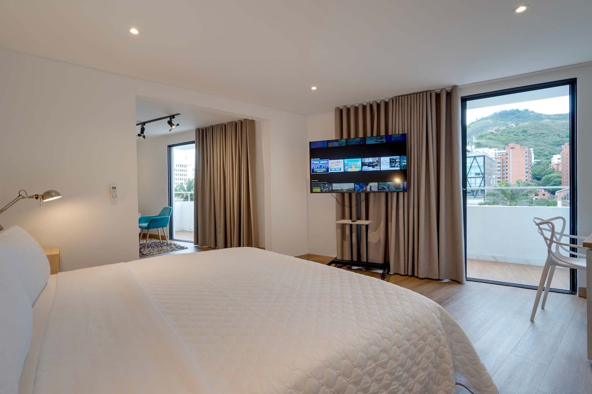 EXSTR APARTMENT ERE CENTENARIO 202 🌴 Stay in comfort and style in this elegant second-floor studio, ideally located in walkable Centenario — steps from the culture, gastronomy and nightlife of Bulevar del Río, Granada, and El Peñón. Featuring a European King bed, A/C, SmartTV, unlimited hot water, and a fully equipped kitchen. Dedicated fiber-optic internet (99%+ uptime) makes this a rare find in Cali, perfect for digital nomads, executives, solo travelers, and couples seeking a premium stay.