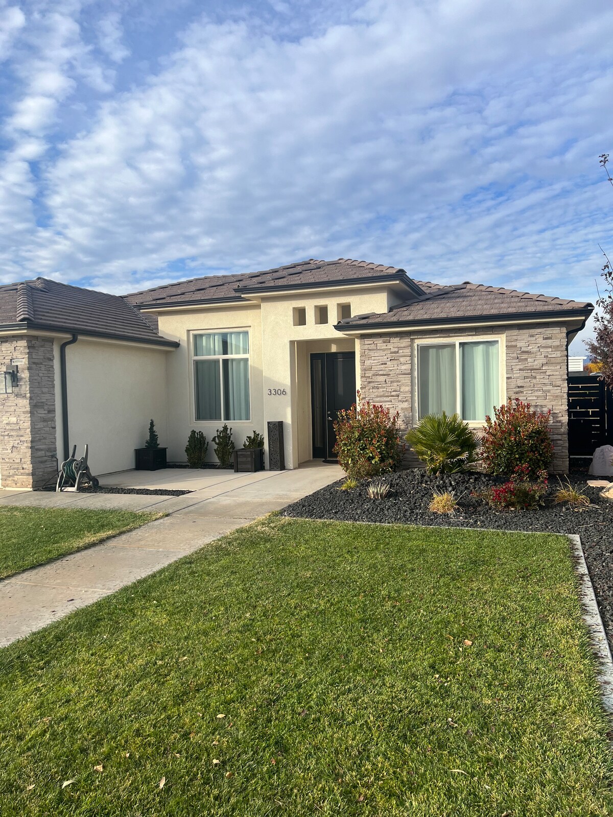 Come enjoy the GramLux at Sand Hollow and forget your worries in this spacious and serene space. Located within a couple minutes from Sand Hollow Lake, Sand Dunes & Golf Course. This 2,200 sf, 3 bed/3 bath has plenty of room for 8 guests. It boasts a master bedroom with walk-in closet, quarts counter tops, office space, soaking tub, walk-in shower and amazing mattress. A well supplied chef's kitchen, patio with wet bar, dining table, hammock, fire pit, and a gas/charcoal BBQ for outdoor cooking.