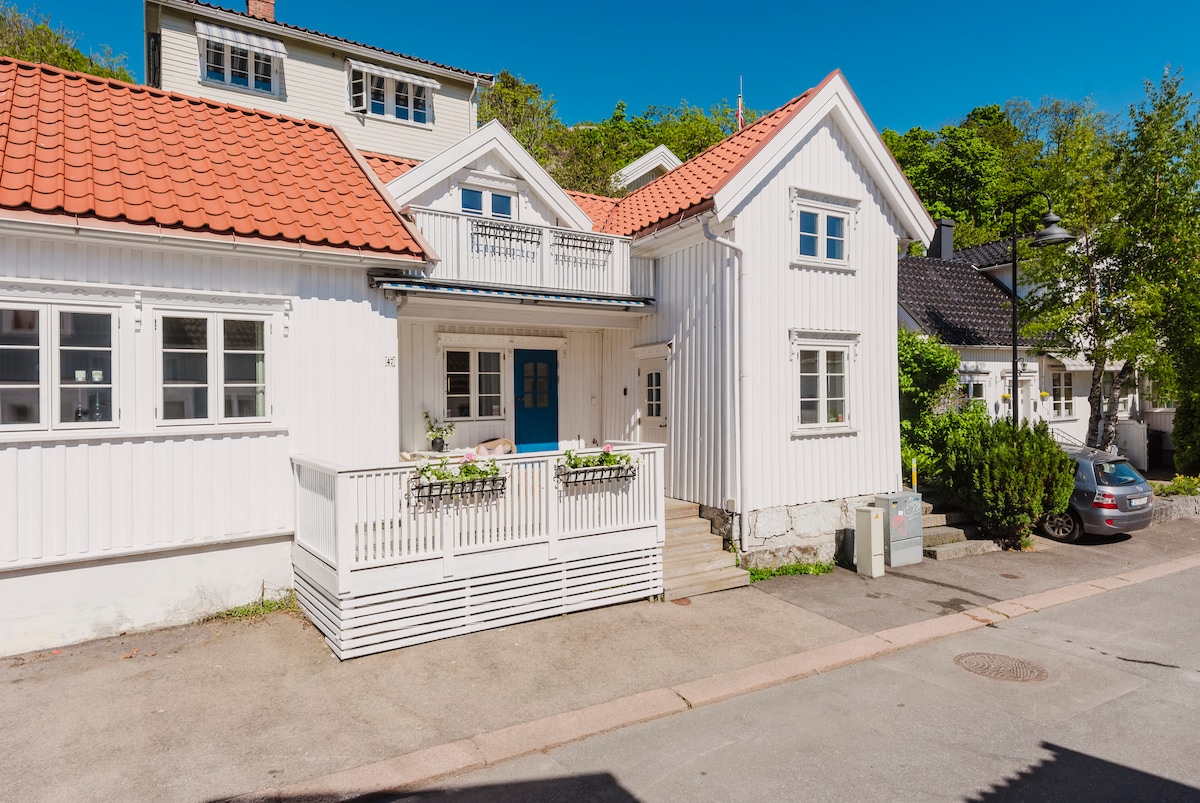 Idyllic house from the year 1800 in Sandefjord's coziest street. Sunny. 1st floor: entrance, kitchen, large living room, bathroom and bedroom. 2nd floor: 2 bedrooms, living room with sofa bed, lounge. Very low ceiling height on the 2nd floor. Beds for 9 and the house is fully equipped. Free street parking outside for 1 car. The house is located in one of the city's oldest streets with romantic and protected houses. Here you live 2 minutes walk from the city center and the harbor. Short distance to the railway and bus. Beautiful Preståsen is just behind the property. Quiet neighborhood