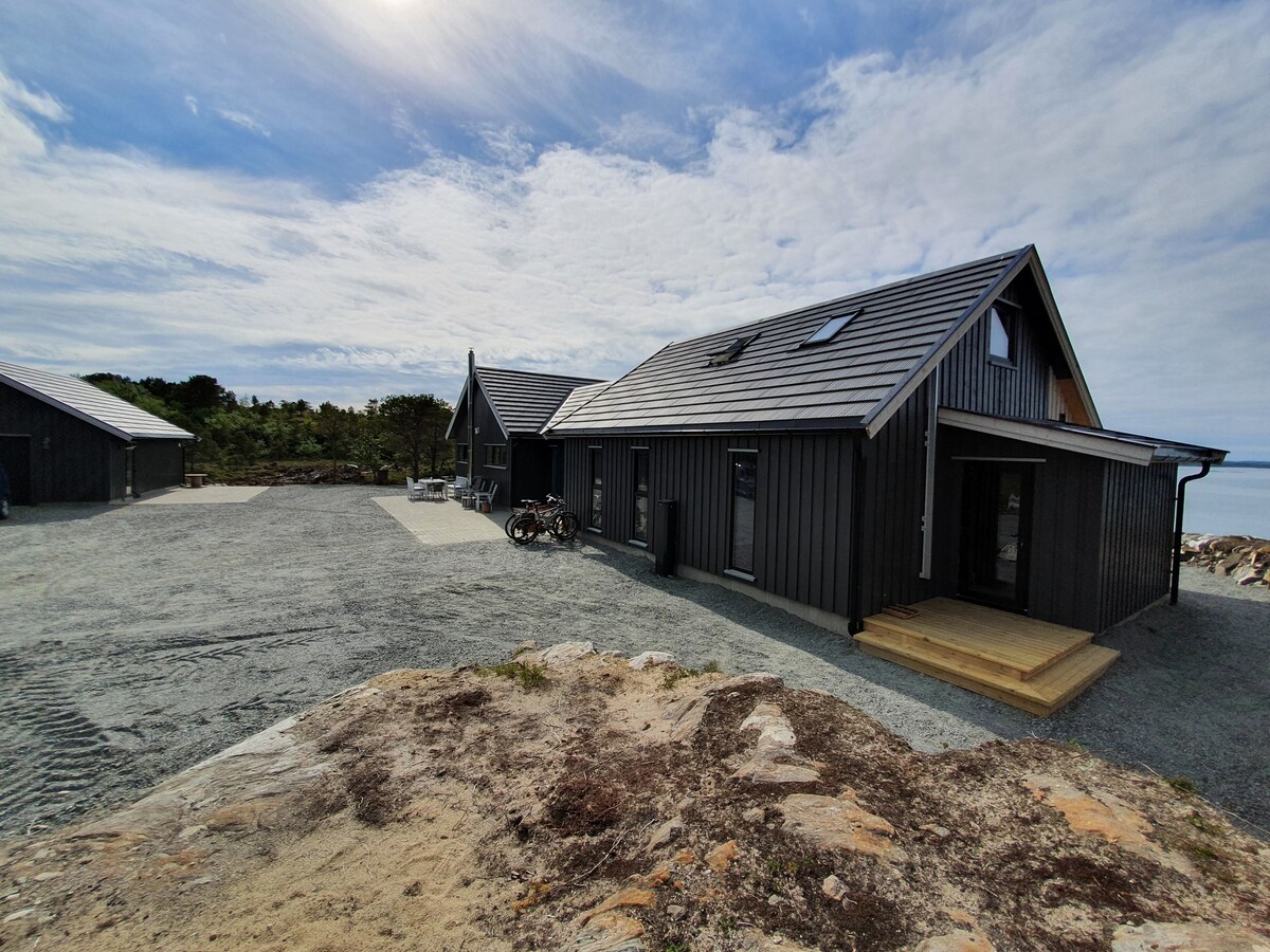 Bright and modern cabin. Newly built in 2018. Spotlights in the ceiling, fridge, dishwasher, stove and hotplates. Dining table with room for 6 people. Cable TV and sofa. Tiled bathroom with rainfall shower. 2 bedrooms with double bed plus loft with space for 2-3 people. View of mountains and the ocean. Terrace with outdoor furniture and barbecue.