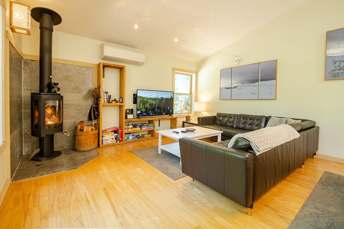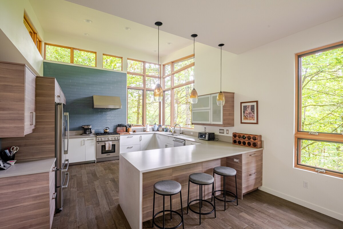 This 2BD architecturally modern, spacious and light filled home is built on a historic homestead site perched above the Sandy River. Close to Mt Hood Natl. Park & only 45 minutes from the Portland Airport- Enjoy outstanding skiing, mountain biking, hiking, tennis, golf and other outdoor adventures without sacrificing modern luxury and comfort. Or cozy at home in peace. EXPAND to 3 BEDROOMS by adding the extra KING OR QUEEN SUITE depending on your party size for an additional $95 per night.