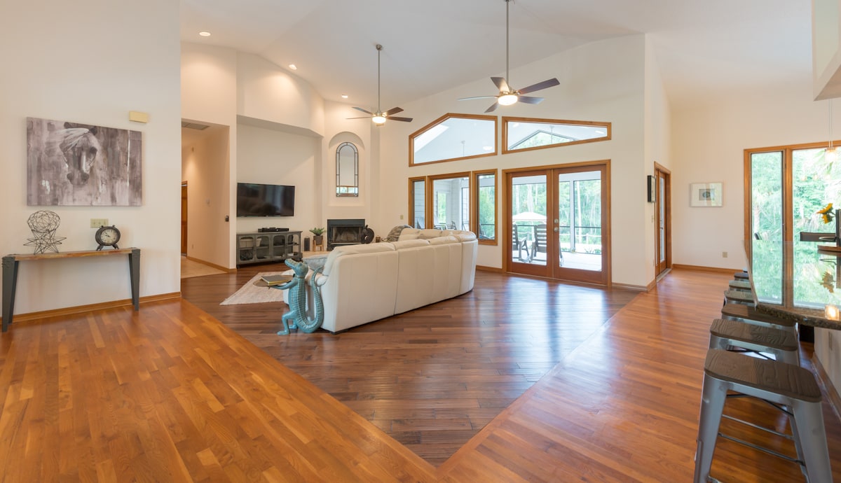 NEW PHOTOS COMING SOON!! Adventure awaits you and your family at the Wekiva River Retreat! This beautiful home is nestled in the heart of real Florida and sits directly on the banks of the Wekiva River. You and your family can explore the natural landscape in our fleet of Kayaks and canoes, or walk to the Rock Springs Run State Park for hiking, biking, and trail riding. Finish the eventing under the stars around our large fire-pit roasting marshmallows, or watching movies on our big screen tv.