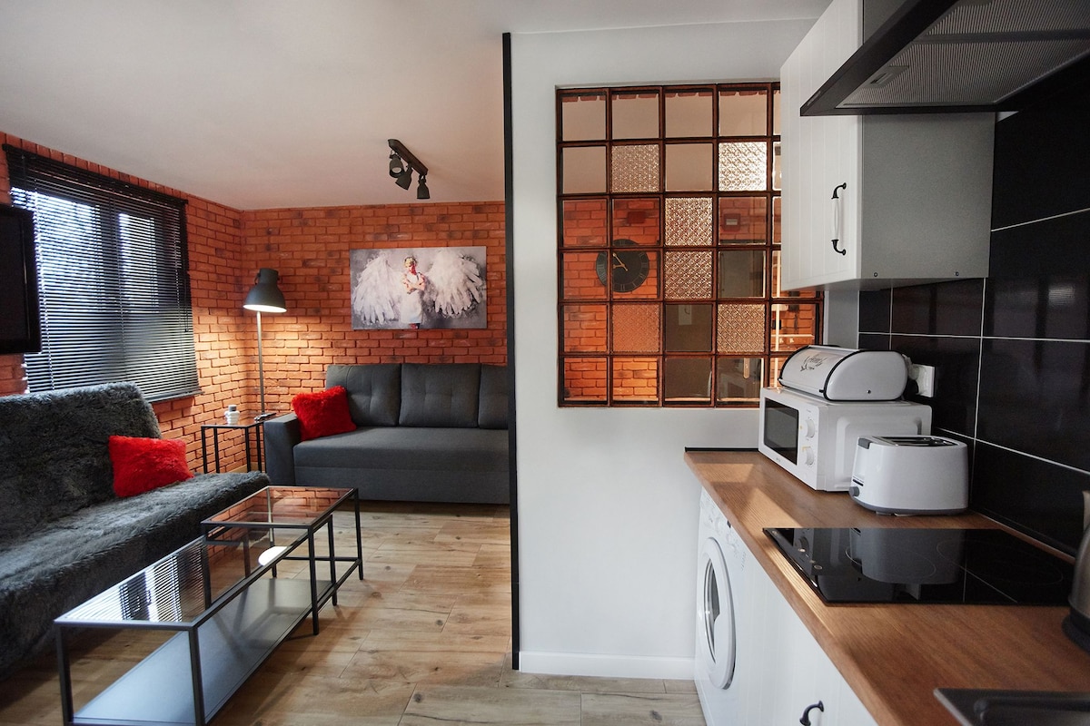 The apartment is located on the ground floor of the building with direct entrance from the parking lot. Nearby there is the Open Air Museum and Sanok Castle (Beksiński, icons), the surroundings are picturesque forests and charming ponds. The interior, stylized with red accents, is characterized by high quality finish and attention to detail. Complete equipment (kitchen and bathroom), large corner sofa and bed make the apartment great for a couple or family. Extra beds allow more people to stay.