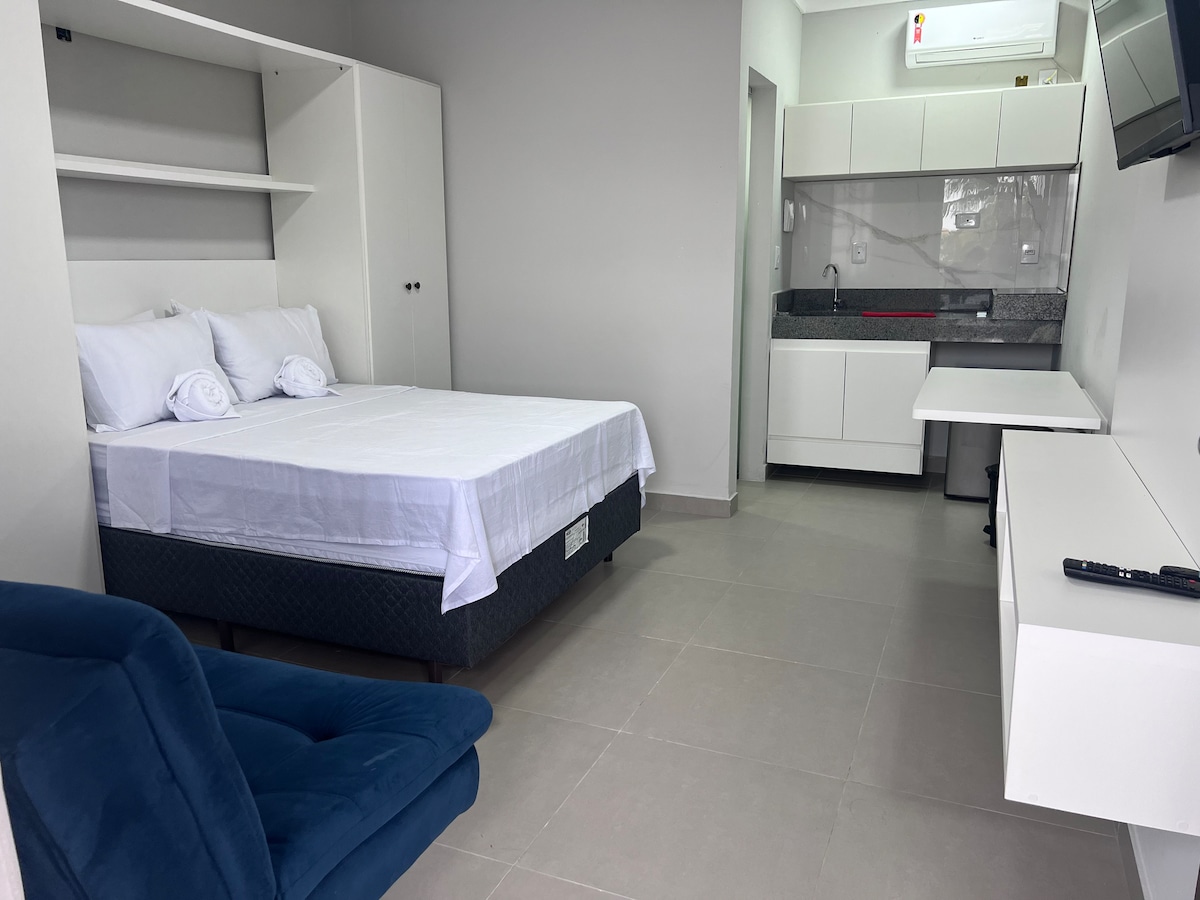 On the edge of Porto Seguro, America Praia Apart Hotel in front of Taperapuan beach, offers an outdoor pool (ideal for children to enjoy), garden, parking and 24-hour reception. They have air conditioning,fan, private bathroom, Smart TV, wifi,living room, full kitchen with microwave, refrigerator, stove. A beautiful balcony with a hammock. The condominium is well located with a Food Truck in front with several food options and with a market, pharmacy 50 meters away.