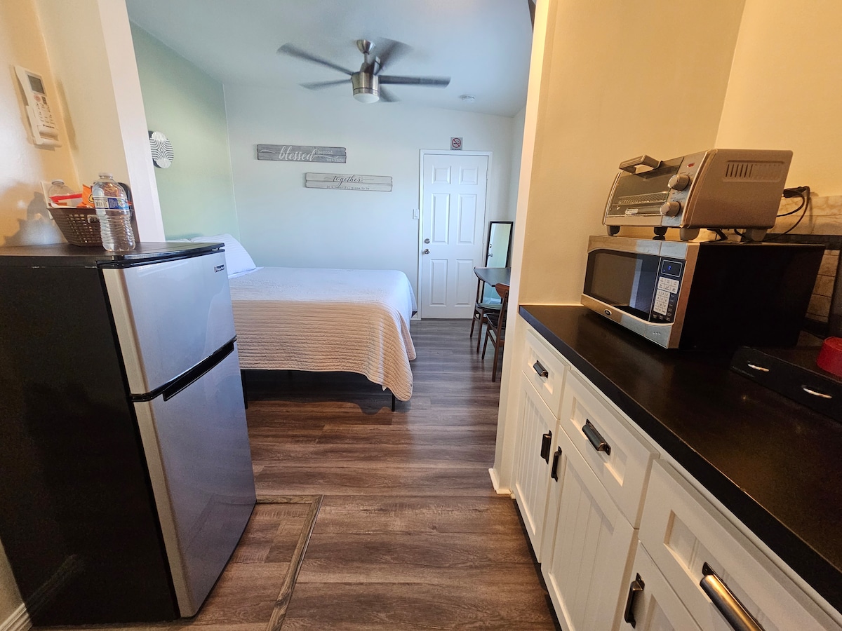 **We ask for a picture of your Government ID upon booking. **We only rent to guests with at least 2 reviews and a 5 star rating. **It is a small 187 sq/ft studio room sectioned in 3 areas. Enjoy having a whole studio room to yourselves with a side entrance to come and go as you please. Has a Private bathroom with towels, hair dryer, ironing board and computer desk to make this quiet retreat a place of rejuvenation. Booking dates are final, we do not accept alterations for early check outs.
