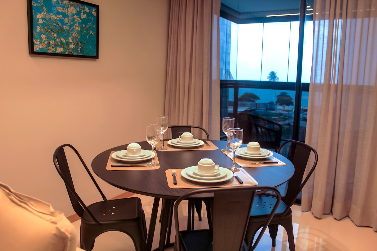 Apartment for up to 4 guests with amazing sea views on Pajuçara Beach. The building has a SPA, Jacuzzi, adult and children's pool, sauna, toy library, laundry, game room, and gym. Choose to be close to the city's main attractions with hotel structure and price that fits in your pocket. Apartamento has Queen size bed and sea view from the bedroom Air conditioning in the living room and bedroom. 100% air-conditioned apartment Kitchen equipped with utensils Balcony with sea view Parking