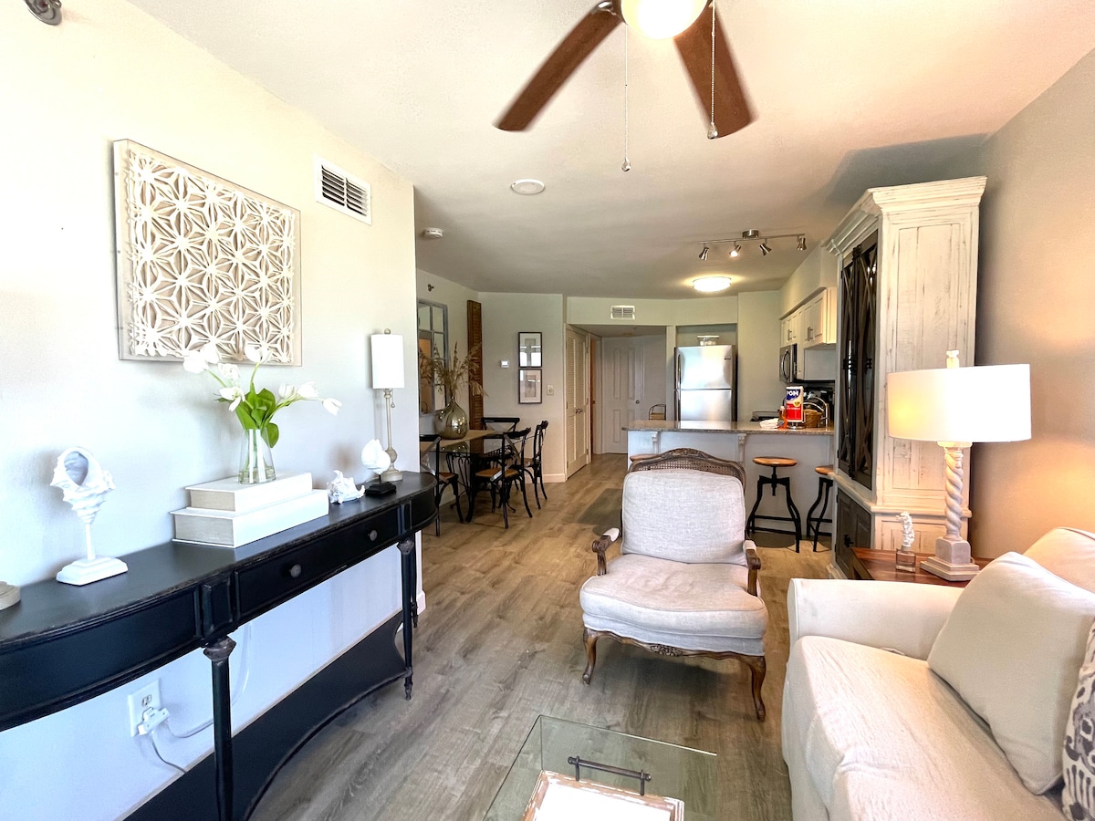 Beautiful 1 bedroom, 1.5 bath condo sleeps 6. Bring your swimsuits and get ready to relax! Condo is on 12th floor, tower closest to the pier. - 1 bedroom with king size bed, cozy bunk area for kids, and gel foam mattress on fold-out sofa. (ALL MATRESSES NEW IN SEPTEMBER 2025). - All linens and towels provided, including beach towels! - 2 beach chairs, 2 boogie boards and a beach umbrella included - Washer & dryer - Fully equipped kitchen to enjoy dinner with a view - Wi-Fi & cable