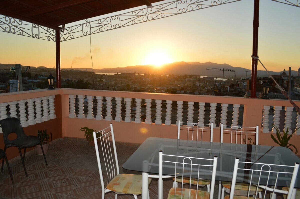Modern house located in the historic center of Santiago, has essential room but comfortable, with private bathroom, air conditioning, fan, minibar, sala TV, the house also has a nice terrace with great views of the city, our house makes a difference in Santiago because is located in central zone but while in a quiet area, the upper level of the house is completely dedicated to our guests, allowing more privacy, definitely the best option to spend an unforgettable stay in Santiago de Cuba.