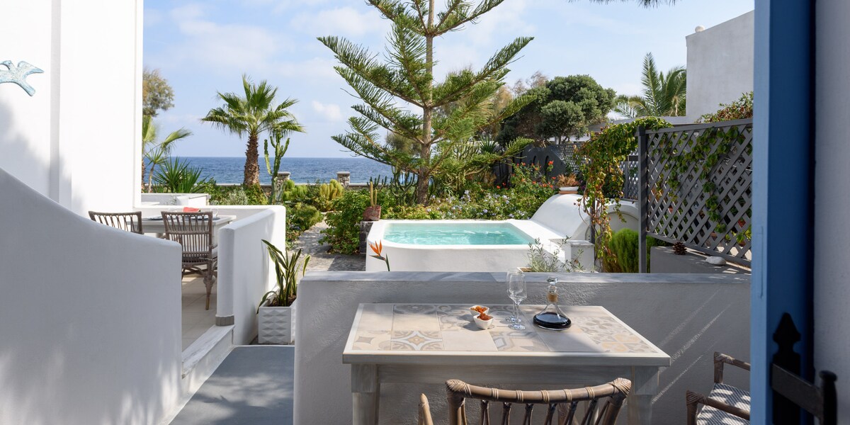 This elegant suite is perched on the cliffs of the caldera in Oia. It combines traditional Cycladic architecture with a minimal decorative style, making it the perfect choice for those who want to relax. The suite is aprox 37 sm, features a private outdoor cave hot tub, offering privacy along with stunning views of the caldera and volcano. Breakfast is included in the price. The room is equipped with air conditioning, free Wi-Fi, coffee and tea-making facilities, bath amenities, and a smart TV.