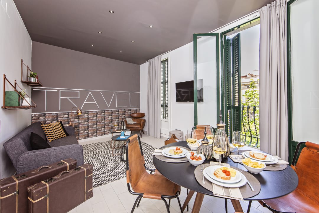Welcome to your stylish and familiar 125m² retreat. Designed for supreme comfort, this contemporary apartment truly feels like a home away from home. Floor-to-ceiling windows bathe the space in light and connect you to a lush, beautifully arranged patio. Located near Sants Main Train Station (Sants Estació), our strategic position ensures exceptional connectivity with direct, easy links to the airport and city centre. Enjoy effortless travel and an unforgettable family or business stay.