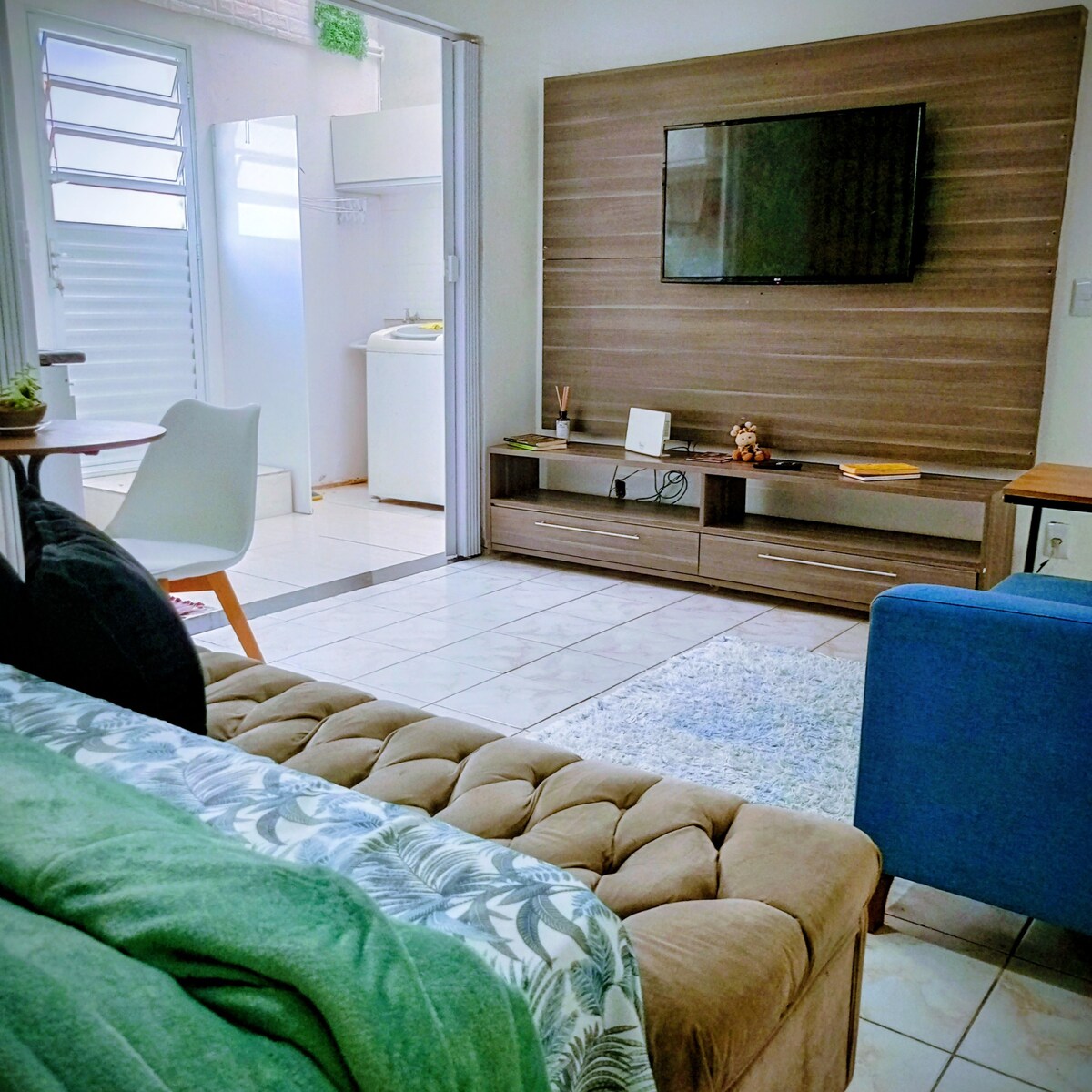 *** Accommodation for 1 person only *** Relax in this quiet, stylish space. double bed, hot/cold air conditioning and washing machine. - Vivo fiber Internet (300Mb). - Private kitchen with frost-free refrigerator, stove, microwave, Nespresso coffee maker, and household utensils. - table for home-office. - Samsung Smart 4K TV - 43”. - Change of bed and bath linens once a week. - Shared outdoor area with another guest (gym and garden)