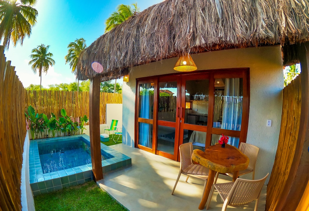 Casa Caroá is a beautiful and modern house right on the sand. The house has three spacious individual chalets behind the main house. The chalets are spacious suites with air conditioning, minibar, king beds, TV and outdoor shower. Guests can also use the shared beachfront pool. Casa Caroá has a small shared kitchen, which guests can use to heat and consume simple foods, dishes brought from restaurants and drinks. Note: the small kitchen is not a full kitchen and does not have a barbecue grill.