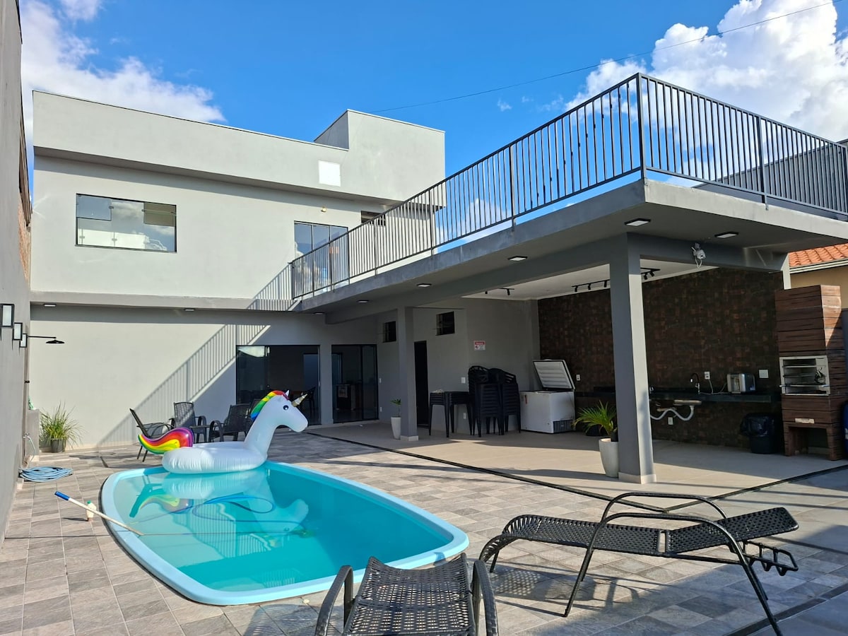 The house is located at the exit of the city, on the way to the waterfalls, mountains, hiking trails and accommodates 10 people, 1 en-suite with air-conditioning and digital TV with more than 250 channels and 1 bedroom with air-conditioning, TV room with digital TV with more than 250 channels, leisure area with swimming pool, 2 balconies with barbecue and freezer, 2 toilets, Wi-fi, social bathroom, bed linen, blanket and pillow. Kitchen equipped with pots and pans, crockery, stove, refrigerator and microwave."