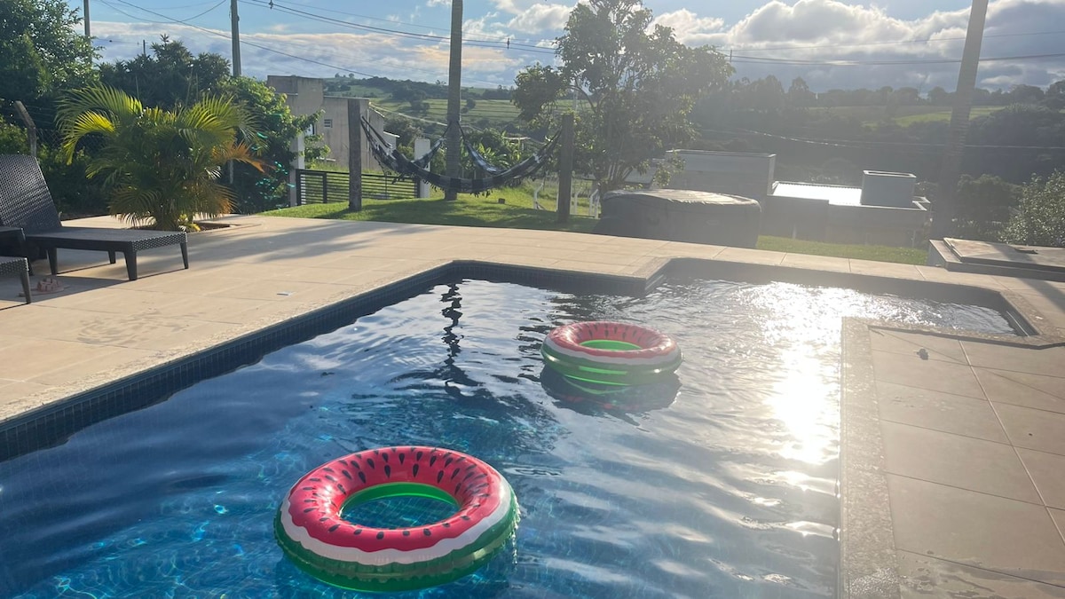 The ideal place for you and your family, complete and well-equipped house. More than 230 Positive Reviews!! 400 MB Internet - Fiber Optic. Beautiful and comfortable farm surrounded by greenery and with various activities for the family such as ecological trails, 3 lakes and lush reserve forest. 24-hour Security and Entrance Gate... Great place to rest, relax and enjoy nature. Fireplace... Private Pool, Gourmet Space with barbecue, wood stove, c. dolls. Pets are okay, but no more than 2.