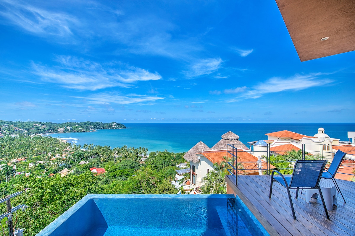 Romantic spacious one bedroom apartment with panoramic ocean views and a private heated pool in the tranquil north end of Sayulita *High speed wifi via Sayulitawifi * Smart TV *Air conditioning and ceiling fans *Kitchen with stove, oven, microwave, blender, coffeemaker and all utensils *Breathtaking panoramic views of the entire bay *King bed, pillowtop mattress *Parking for 1 vehicle *Interior soaking tub and exterior private heated pool *Spacious common area pool and grill *Gym and Yoga