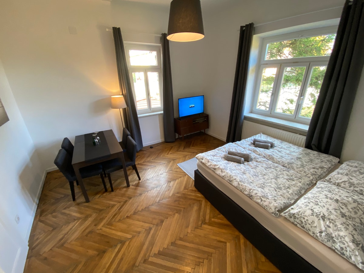 Unser ganz neu renoviertes Apartment verfügt über ein separates Wohn-bzw. Schlafzimmer. Ausgestattet mit einem gemütlichen Doppelbett und einer Schlafcouch für 2 Personen .Die Küche ist ausgestattet mit 2 Kochplatten , einer Spüle , Kühlschrank und einem Geschirrspüler. Das Badezimmer ist modern gestaltet und bietet eine ebenerdige Dusche. Kostenloses TV und Wlan steht Ihnen im ganzen Haus zur Verfügung. Ein genussvolles Frühstücksbuffet können wir gleich nebenan anbieten. (Bezahlung vor Ort)