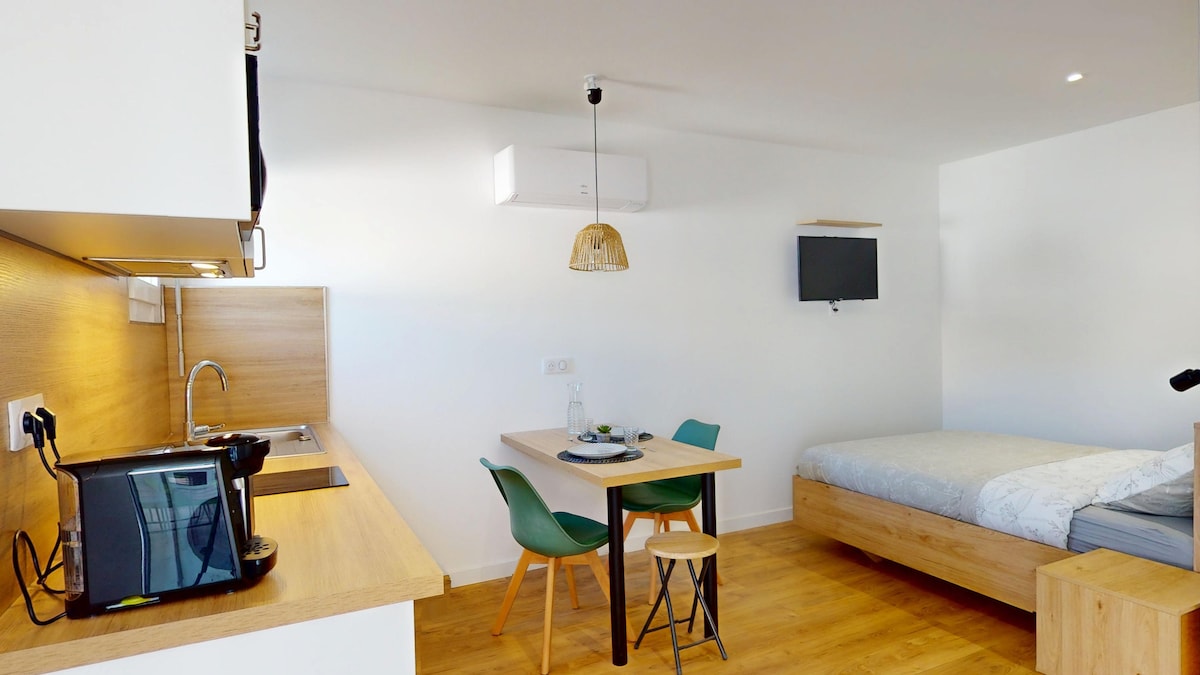 Welcome to all, Enjoy a fully renovated studio, ideal for relaxing for a weekend or more. Located 10 min max from the city center of Pau, a bus stop is located in front of the accommodation, shops nearby (supermarket, bakery). Very comfortable bed, functional kitchen, air conditioning, charming bathroom, also enjoy a beautiful terrace to share great meals!