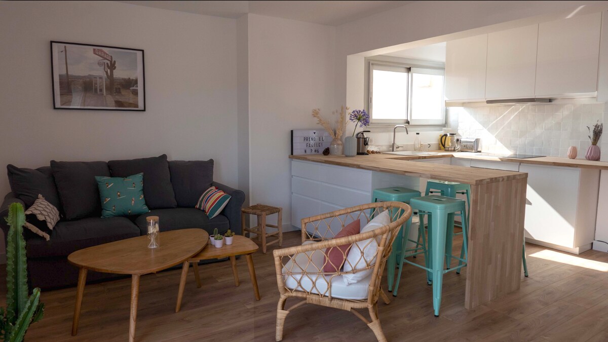 Close to the beach 300 m, Lac Marin 400 m, the city center 600 m, independent 2-room maisonette with private terrace, fully equipped, with wifi, washing machine, dishwasher, TV as well as a double bed in the bedroom and a sofa bed in the living room. Outside, a private and shaded terrace with a barbecue is reserved for you. The sunny swimming pool from morning until evening reserved for vacationers awaits you. Street parking. Linen/towel not included, rental available.