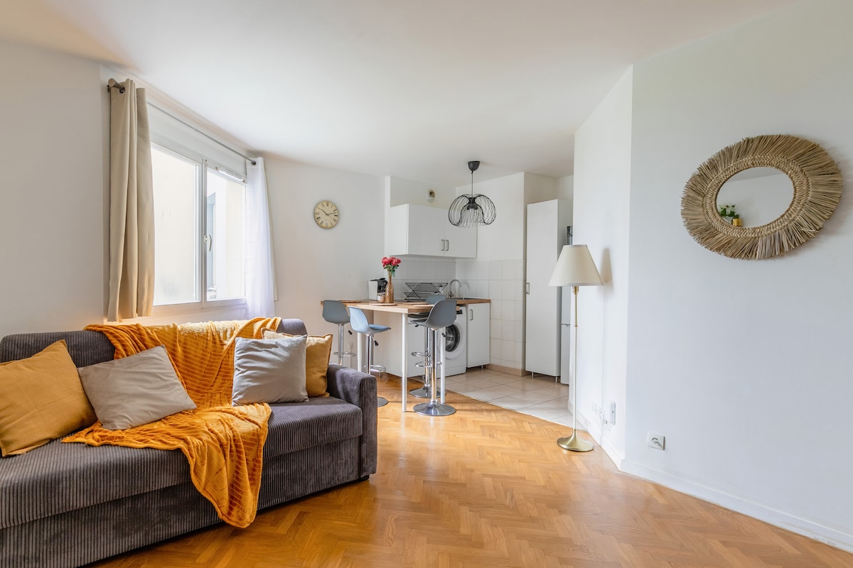 Profitez d’un superbe appartement 2-pièces entièrement refait à neuf, idéal pour 4 personnes. Cuisine ouverte avec bar et tout l’équipement : machine à café, micro-ondes-four, lave-linge et vaisselle complète. Salon confortable avec canapé convertible et TV 50’’ offrant plus de 200 chaînes, Netflix. Chambre avec lit King Size, LED intégrées et prises dans la tête de lit. Belle salle de bain avec baignoire. Entrée autonome + parking sécurisé. À seulement 3 min du métro et 20 min du centre-ville.