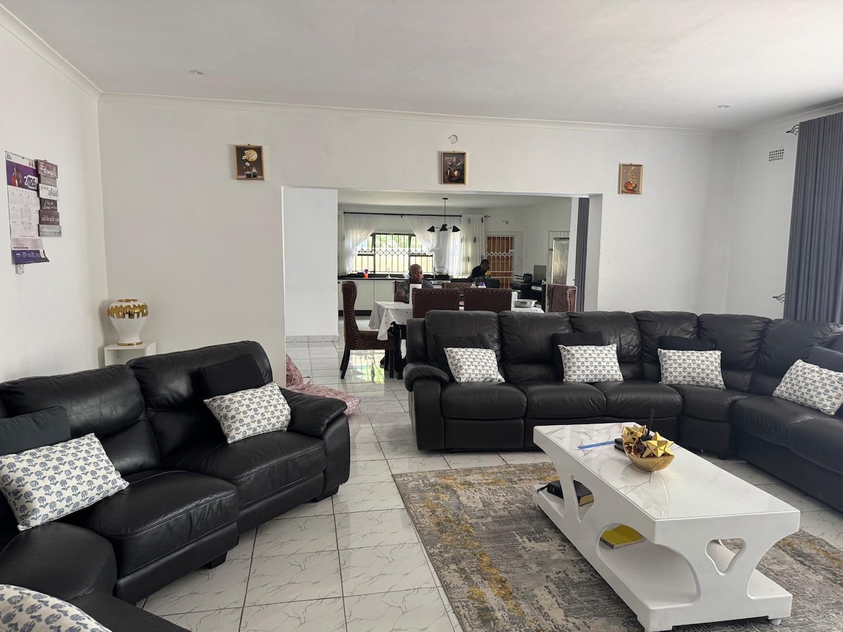 Experience luxury and comfort in this stunning house just 14 km from Harare CBD. Perfect for families , groups , "roora" hosting , family gatherings , corporate meetings, COUPLES get together Graduation etc Close to Amfcc , PHD Ministries . Your ideal Harare stay awaits! Great Security 6 emaculate bedrooms Morden kitchen Solar back up Breathtaking large relaxing garden Prolific borehole Unlimited Wifi Only 14 km from Harare City Centre Close to Amfcc and PhD ministries Automated garage doors