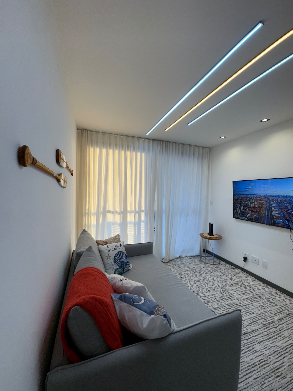 1,600 meters from the beach, AIR CONDITIONING, 700 MEGABYTE VIVO FIBER INTERNET. AP 65m² in Nobre de Vitória area, 2 bedrooms, Praça com food thruks, prox. Airport, beautiful beaches, Ilha do Boi, Praia Camburi, Ilha do Friar, Shopping malls, safe neighborhood, 01 single box, equipped kitchen, new duplex fridge, cooktop, Everest chilled water filter, microwave, double room, box Queen bed, living room with sofa bed, Smart TV 50" Netflix, frost free frost refrigerator, service area, washing machine.