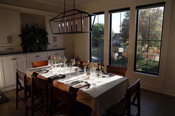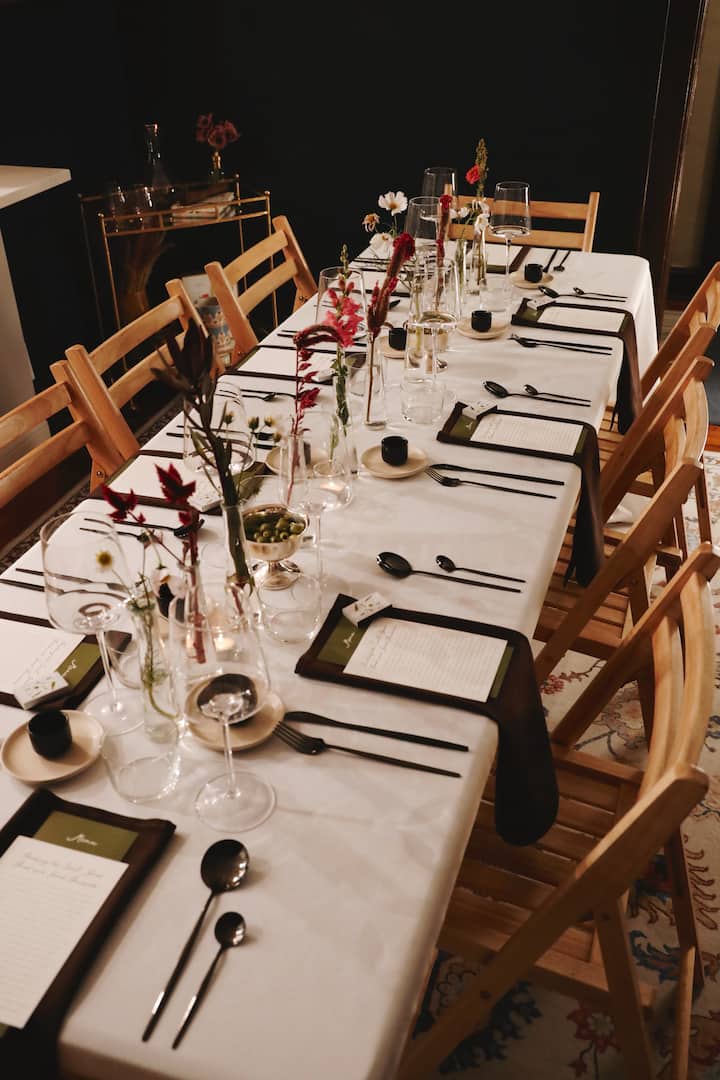 We cook a 5-course meal with snacks at the comfort of your own home. We also provide all the tableware, dinnerware, silverware, glassware and flowers.