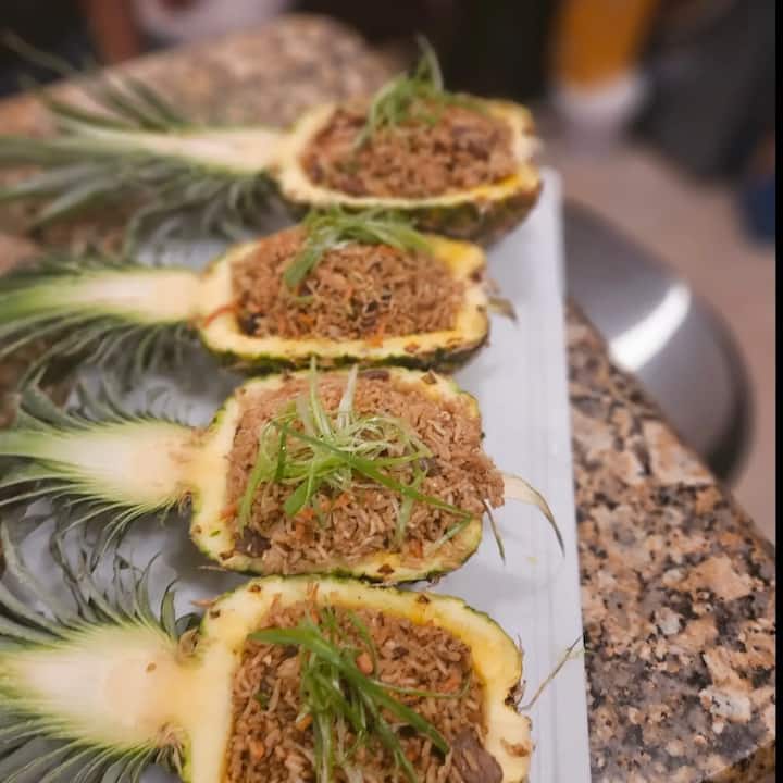 Pull up hungry and savor a compelling combination meal that includes pineapple fried rice, fall-off-the-bone pork ribs, and creamy macaroni and cheese. It's an unforgettable trio of flavors.