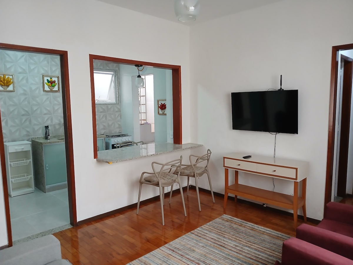 Enjoy an amazing experience at this centrally-located place. Have the convenience of having all kinds of shops you need just a few steps from home. The apartment is a 2-minute walk to Teresópolis Shopping, the city's main shopping mall, and the Walk of Fame. The apartment is ready to welcome you and your family with all the comfort, security and coziness. Every detail was designed for this. We have in the apartment: - 600 MEGA Wi-Fi - 32" Smart TV - Bed and bath linens included - Compact kitchen