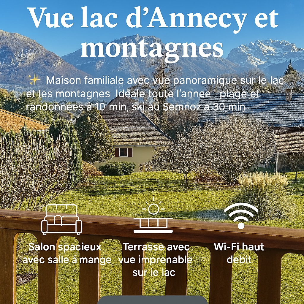 The charm of the countryside and the proximity of the city between lake and mountains. New apartment in a renovated farmhouse, in the heart of a charming, quiet and authentic village. View of the lake and mountains. Located at the foot of Semnoz and 5 minutes from the lake and shops. Greenway to reach Annecy or the beaches.