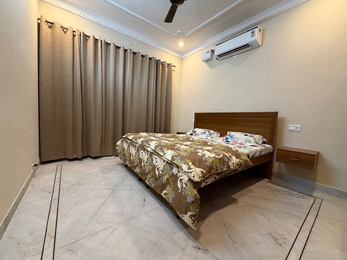 Relax in an independent first floor in a house that offers two ac bedrooms/two washrooms/ one kitchen/ one ac hall, while enjoying your favourite tv shows in a huge screen available in the peaceful and private living area, by also preparing your meals in the personal kitchen equipped with a fridge, 4 burner gas stove, water ro and utensils, tea and sugar are available. Unmarried couples are also welcome. Self check-in. No time restrictions! One cosy balcony sitting, all private, no interference!