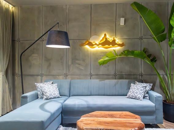 Brutalist Architecture meets a touch of modernism in this breathtakingly beautiful 3 BHK Apartment located just a few meters away from the famous Sony World Signal at Koramangala. It is designed with impeccable attention to detail to maintain a balance between styling and comfort. It has all the required amenities like a full fledged kitchen, ACs, wifi, Bar counter, power backup, wet and dry bathrooms, elevator, 2 balconies and covered car parking. The huge plants do add life to this place.