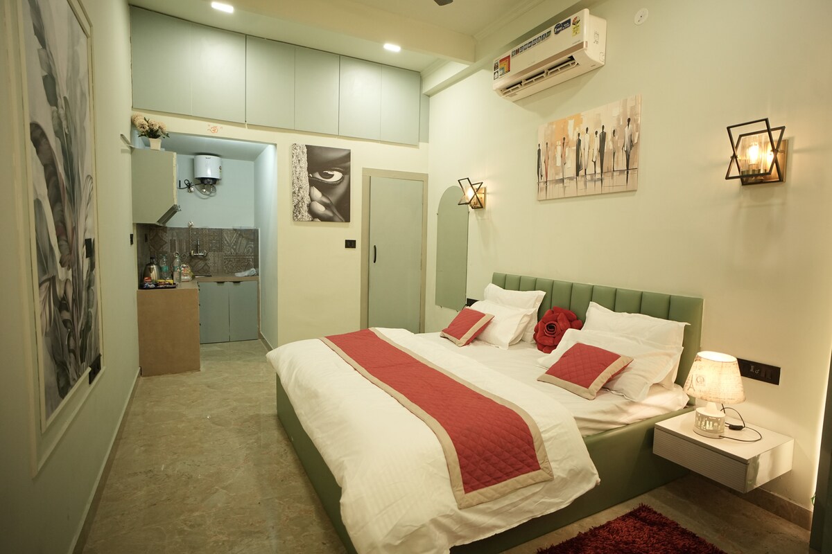 The Casa99 Premium Suite offers a luxurious and spacious retreat, featuring a comfortable bedroom. The suite is equipped with soft sofas for relaxation, an attached modern bathroom, and a fully equipped kitchen with essential appliances like a stovetop, fridge, and cookware. With elegant decor, ample space, natural light, complimentary Wi-Fi, and air conditioning, the Premium Suite ensures a refined and comfortable stay.