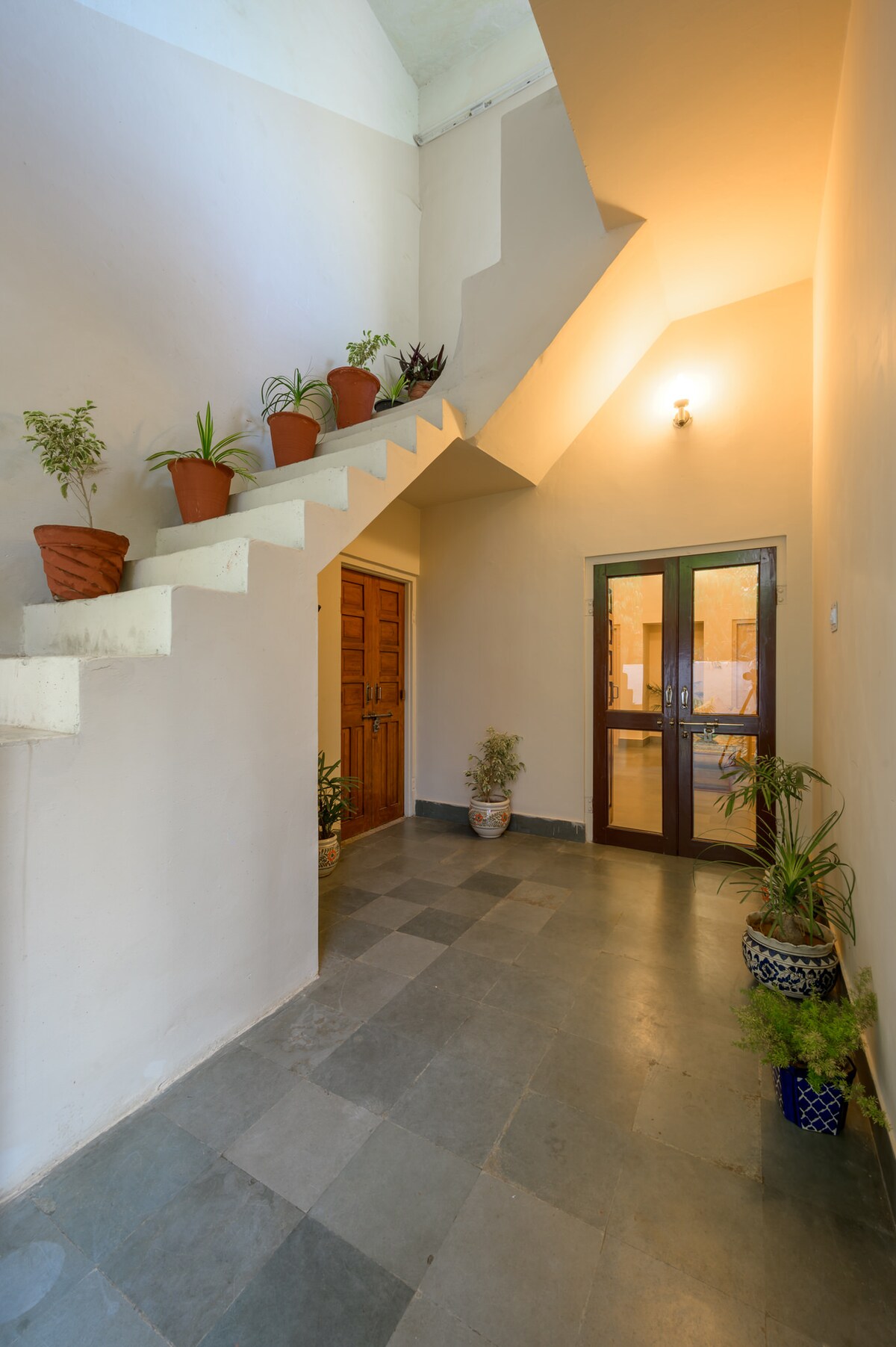 "The Golden Door" is an artistically designed room with an attached bathroom on a private terrace with panoramic views of the Aravali Hills. Ideal for couples, solo travelers, and business professionals, this accommodation seamlessly blends aesthetics and functionality. Its central location grants easy access to major attractions. In essence, "The Golden Door" transcends conventional stays. With its central location, artistic design, and comfort, it provides a simple yet unique stay.