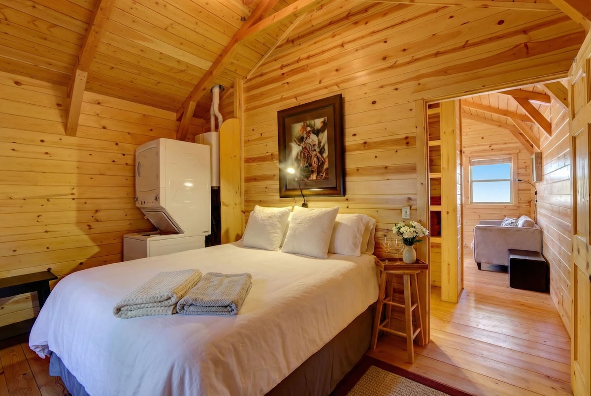 Centrally located and newly built, this stylish two-bedroom home is perfect for couples, families, or friends. Each bedroom has a queen bed and its own climate control for a personalized stay. Enjoy a cozy night in with a home-cooked meal and movie, or head outside to roast s’mores by the gas fire pit. Luxury linens, heated bathroom floors, and plush towels add a touch of indulgence, while two cruiser bikes are available for exploring town at your own pace.