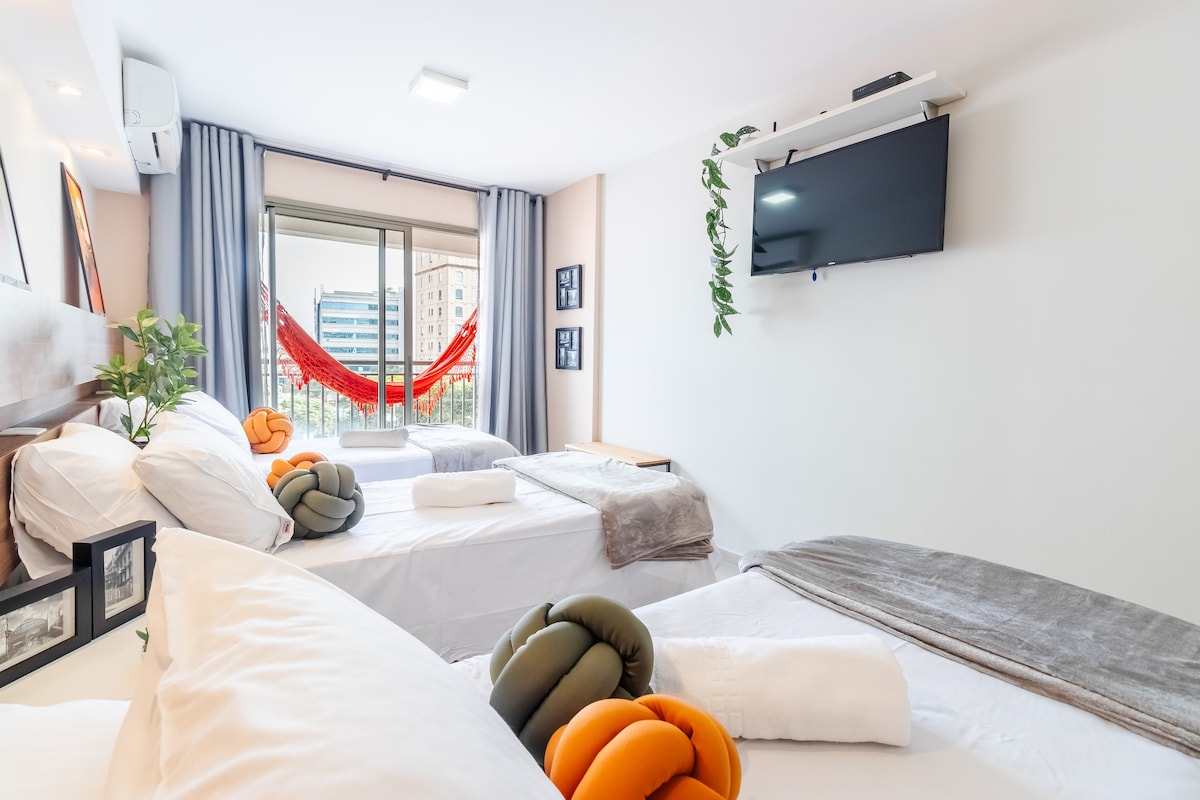 In the heart of São Paulo – Jardins – the Studio is located between Rua Pamplona and Av. Paulista. The building has a pool, gym, gourmet area, co-working area, and Omo laundry facilities. Within a 2-minute walk, you'll reach São Paulo's main metro station: Trianon-Masp. Right downstairs there are two supermarkets and a fresh produce market, along with a Smart Fit gym. There are lots of restaurants and cafes in the area, and MASP and Cidade São Paulo Shopping Mall are just a 5-minute stroll away.