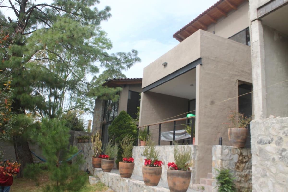A 2 calles del centro. Casa cálida y amplia, combina madera y ladrillo rojo para integrarse con el ambiente de montaña. Cuidada, decorada con estilo mexicano y equipada con todo lo esencial para la comodidad de los huéspedes. Tiene 2 pisos, abajo hay 1 cuarto con 1 cama matrimonial y 1 individual. Arriba hay 1 cuarto con 1 cama matrimonial y 1 litera, y, una estancia (área común) con 1 cama individual y 1 sofá cama doble. También tiene terraza, jardín con asador, chimenea y estacionamiento.