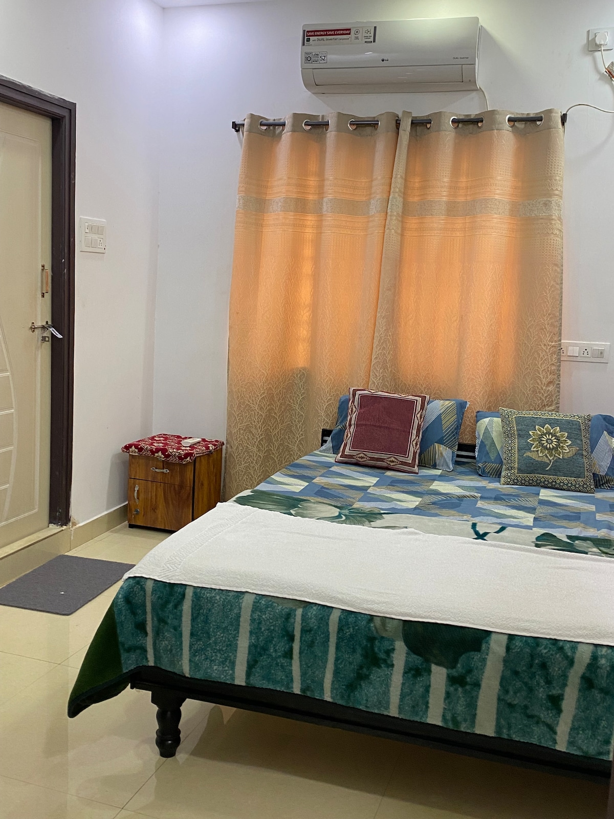 Welcome to your ideal home away from home. Our apartment is on the first floor of the villa without a lift, exclusively for the families only. Unmarried couples and Bachelors are restricted. Our apartment is spacious. A/C in both the bedrooms, with attached bathrooms. Featuring two spacious bedrooms, our retreat ensures a peaceful night's sleep . The master bedroom is with a king-size bed, while the second bedroom is with a queen-size bed, and two additional floor mattresses.