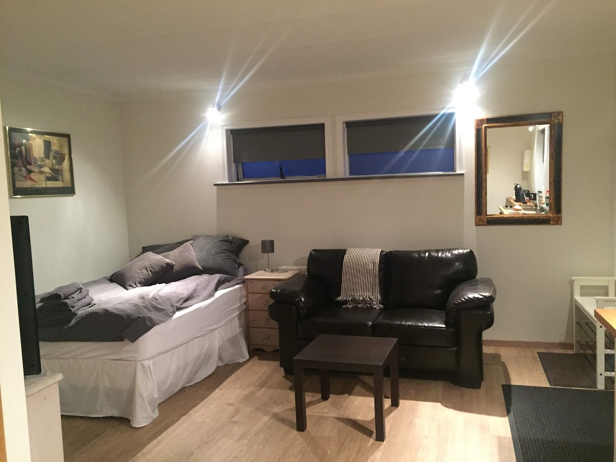 Studio apartment in a quiet neighborhood, 111 Reykjavik (10 km from city center, 10 min drive). Free parking, wifi and tv. 3 grocery stores in the neighborhood. Bus stations in the street (30 min trip to city center). Self check-in from 17pm of arrival date, key box by the front door, private entrance. Code to key box will be sent 48 hours prior to arrival. Sleeping arrangement is 1 queen bed, fitting two adults.